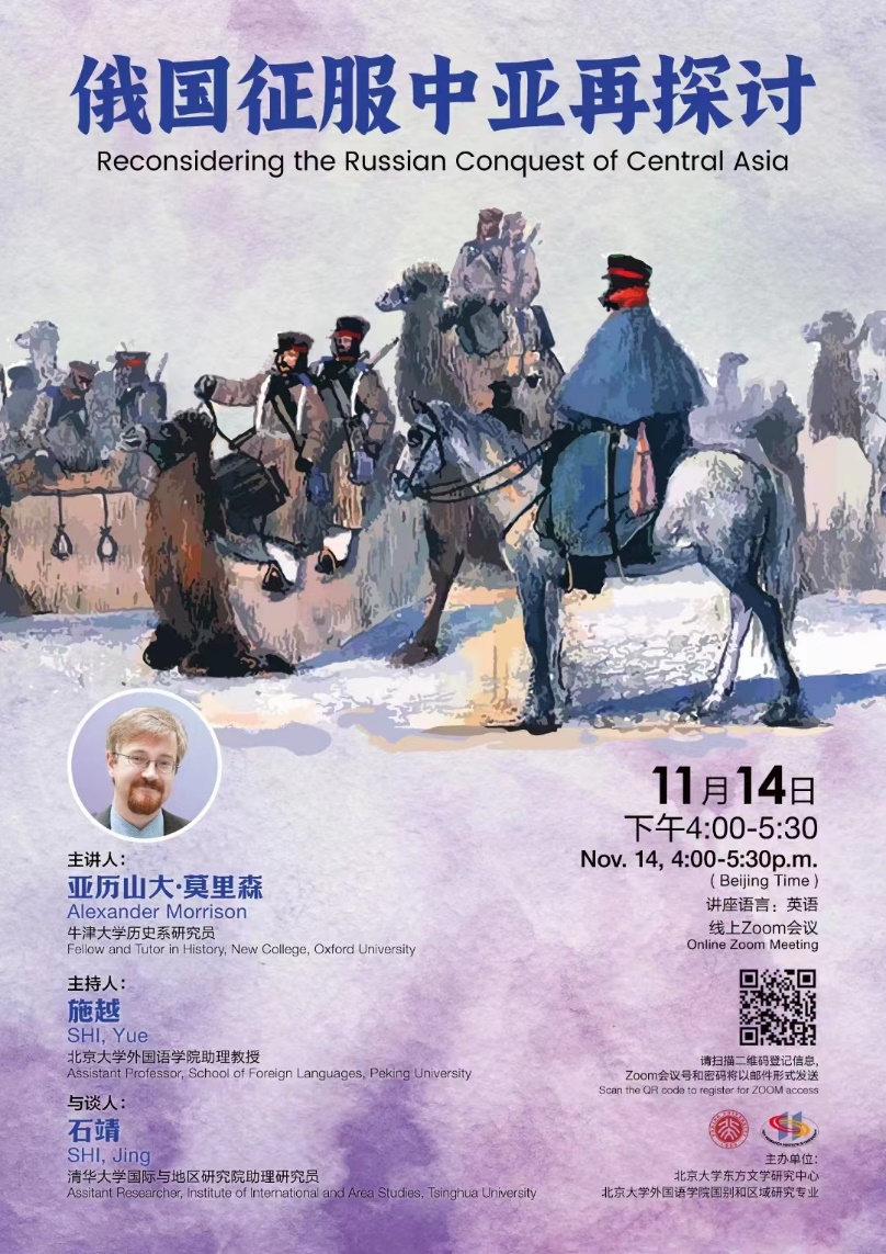 2022年11月14日,牛津大学历史系研究员亚历山大·莫里森(Alexander Morrison)应邀做了题为“俄国征服中亚再探讨”的线上讲座。本期讲座由yl6809永利官网东方文学研究中心、yl6809永利官网国别和区域研究专业主办,yl6809永利官网助理教授施越主持,清华大学国际与地区研究院助理研究员石靖受邀担任与谈人。