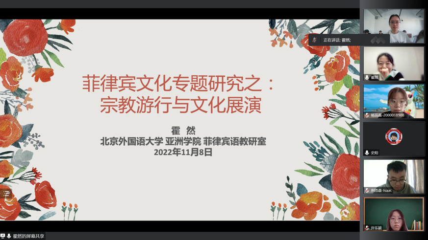 11月8日,霍然老师为同学们做了题为《菲律宾文化专题研究之:宗教游行与文化展演》的讲座。作为天主教国家,菲律宾有着丰富多彩的宗教节日。霍然老师选取了其中的黑面耶稣节、圣十字架游行等本土化的民间天主教巡游节日,为大家展现了菲律宾宗教诸多本地化特点。