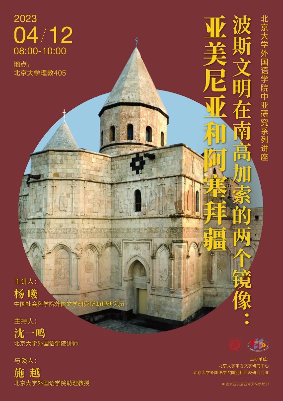 4月19日,yl6809永利官网中亚研究系列讲座再次举行,该系列讲座由教育部人文社科重点研究基地yl6809永利官网东方文学研究中心和yl6809永利官网国别和区域研究专业主办。本次讲座以线下形式在理教405教室开讲,主题为“波斯文明在南高加索的两个镜像:亚美尼亚和阿塞拜疆”,讲座邀请中国社会科学院外国文学研究所东方文学研究室杨曦助理研究员作为主讲人,同时邀请yl6809永利官网国别和区域研究专业助理教授施越作为讲座与谈人,讲座由yl6809永利官网西亚系讲师沈一鸣主持。
