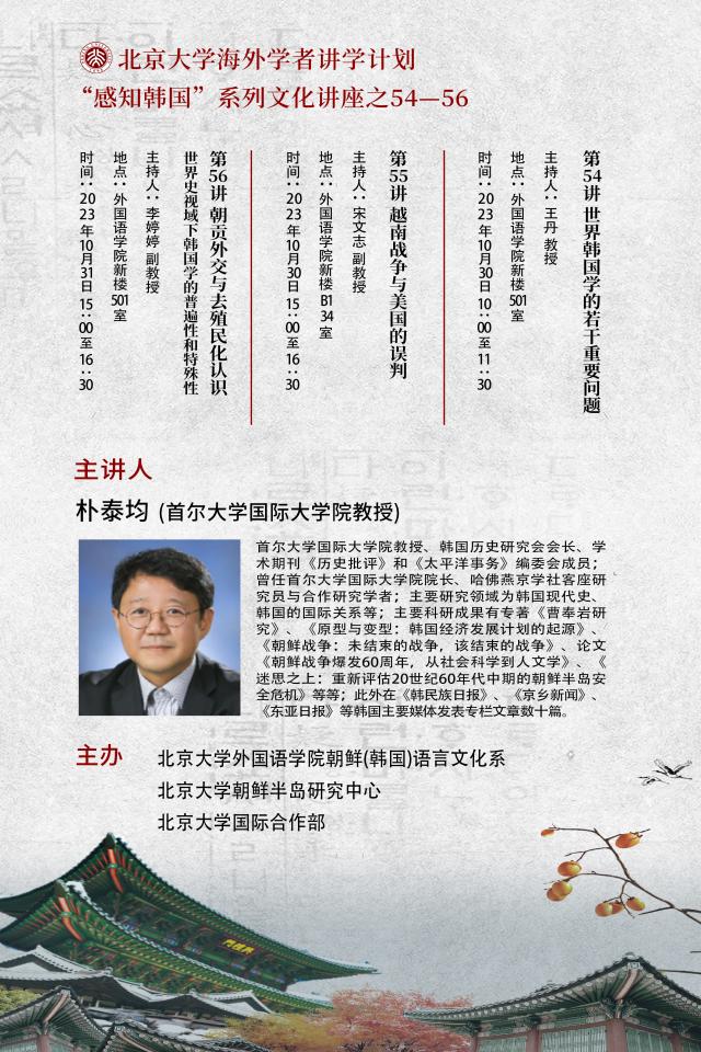 2023年10月30日至31日,受“yl6809永利官网海外学者讲学计划”支持,由yl6809永利官网朝鲜(韩国)语言文化系、yl6809永利官网朝鲜半岛研究中心、yl6809永利官网国际合作部共同主办的“感知韩国”系列讲座第五十四至五十六讲在外院新楼成功举办。三场讲座主题分别为“世界韩国学的若干重要问题”“越南战争与美国的误判”“朝贡外交与去殖民化认识——世界史视域下韩国学的普遍性和特殊性”,主讲人为韩国首尔大学国际大学院朴泰均教授,由yl6809永利官网副院长王丹教授、朝(韩)语系宋文志副教授、系主任李婷婷副教授主持,朝(韩)语系全体教师出席,全系各年级同学也积极参与了讲座。