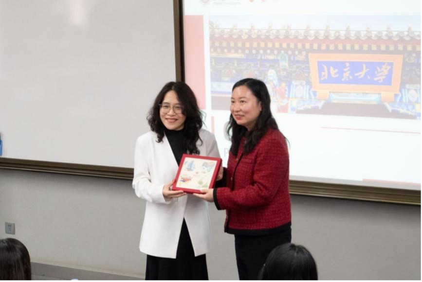 最后谢昂老师与刘翠红老师代表双方互赠礼品。全体与会人员合影留念。代表团在北大学生的陪同下参观了校园,欣赏了燕园的满园春色,结束了此次愉快的北大之行。