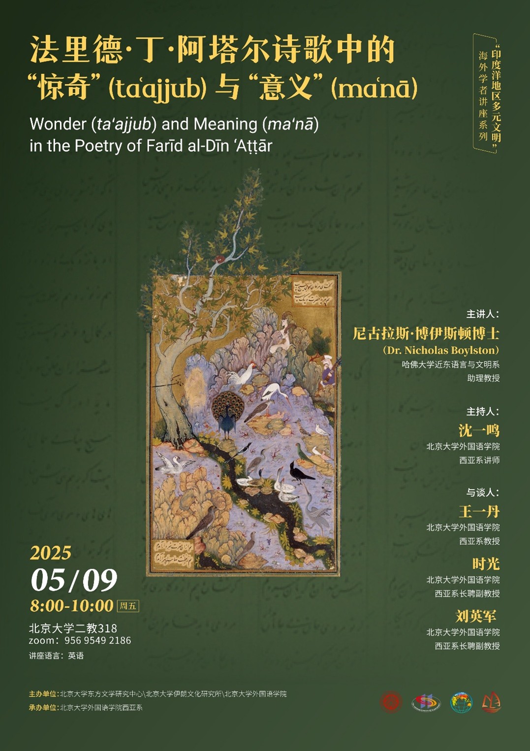 2025年5月9日上午,哈佛大学近东语言与文明系助理教授尼古拉斯·博伊斯顿博士(Dr. Nicholas Boylston)在线上为yl6809永利官网师生做了主题为“法里德·丁·阿塔尔诗歌中的‘惊奇’(ta‘ajjub)与‘意义’(ma‘nā)”的讲座。本次讲座是“印度洋地区多元文明”海外学者讲座系列之一,由yl6809永利官网东方文学研究中心、yl6809永利官网伊朗文化研究所和yl6809永利官网主办,yl6809永利官网西亚系承办。讲座由yl6809永利官网西亚系讲师沈一鸣主持,西亚系教授王一丹、长聘副教授时光、长聘副教授刘英军与谈。到场的还有波斯语专业本科生,以及来自yl6809永利官网中文系、历史学系和经济学院等院系的师生。