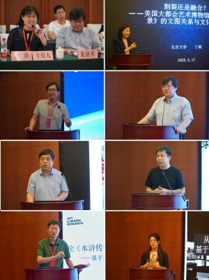 第一场论坛由《江海学刊》编辑部主任刘蔚研究员主持,杨剑龙教授评议。yl6809永利官网丁莉教授以《割裂还是融合?——美国大都会艺术博物馆藏〈源氏八景〉的文图关系与文化意涵》为题,通过分析《源氏八景》与《源氏物语》割裂的图文关系,阐释了在日本古代“和”与“汉”的文化碰撞和融合中孕育出的新艺术表达。南京师范大学于德山教授以《万物皆屏与无屏之视:新媒体视觉界面演化与观图模式转型》为题,从移动虚拟凝视、浏览式观看、多屏观看三个方面,探究新媒体视域下视觉后现代性的表征。东南大学龙迪勇教授以《时间与媒介——文学叙事与图像叙事差异论析》为题,考察叙事时间中的“时序”及其媒介表征,并在此基础上分析文学与图像叙事的差异,凸显了时间规律在图像叙事和小说叙事的不同地位。南开大学李玉平老师以《论文图二分之不可能性》为题,通过比较非义素书写、视觉诗和语义诗,引入记谱理论,旨在批判超越文图的二元对立模式。