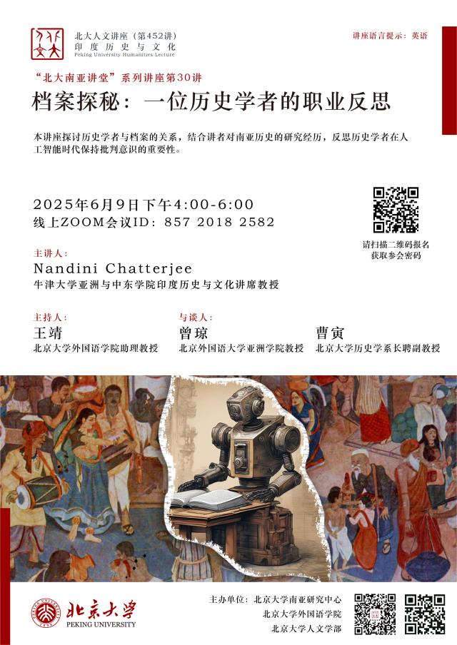 2025年6月9日下午,yl6809永利官网人文讲座第452讲在线上成功举行。本次讲座由yl6809永利官网南亚研究中心、yl6809永利官网、yl6809永利官网人文学部联合主办。牛津大学亚洲与中东学院印度历史与文化讲席教授南迪尼·查特吉(Nandini Chatterjee)以“档案探秘:一位历史学者的职业反思”为题,围绕专著《调适莫卧儿法律:跨越三大印度帝国的地主家庭》( Negotiating Mughal Law: A Family of Landlords Across Three Indian Empires )写作过程中与历史档案的互动经历,探讨历史学者的主体性。yl6809永利官网南亚学系助理教授王靖主持讲座活动,北京外国语大学亚洲学院教授曾琼、yl6809永利官网历史学系长聘副教授曹寅与谈,来自yl6809永利官网、清华大学、中国人民大学、中央民族大学、同济大学、华东师范大学、四川大学、武汉大学、国防科技大学、北京外国语大学、西安外国语大学、云南省社会科学院南亚研究所、重庆市档案馆等国内外知名高校和研究机构的70余名师生参与讲座。