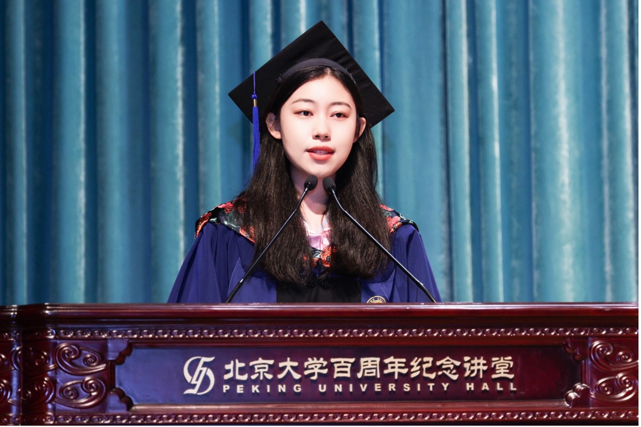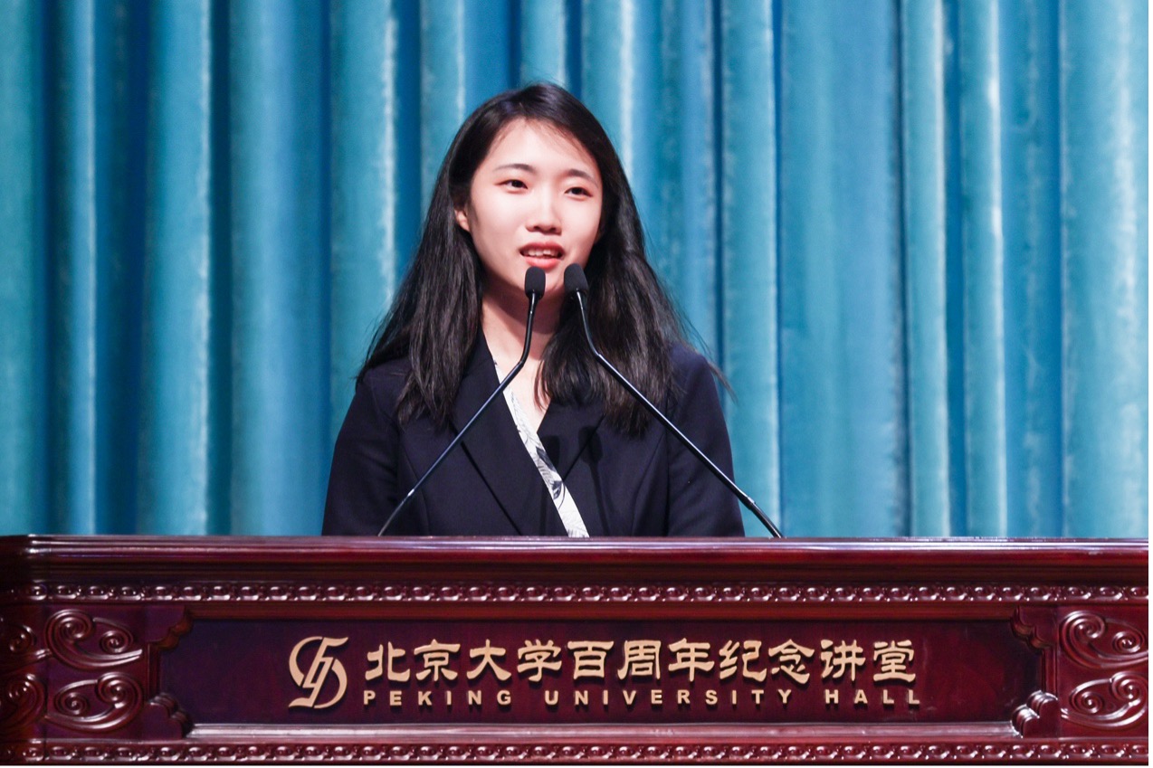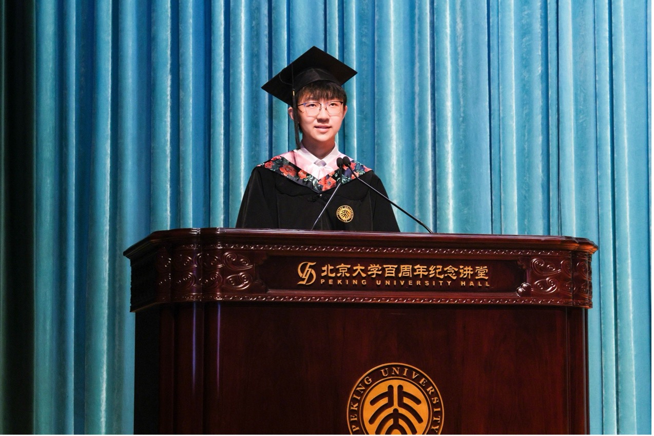 2022级朝韩语系硕士生张可佳作为硕士毕业生代表发言,以“外语、文学、中国立场”三个关键词,总结了北大外院人精神的三重底色。她讲述了自己七年语言学习的“罗曼史”、在文学研究中体悟生活的深度,以及在社会实践中体认“讲好中国故事”的使命。她强调,外语学习不仅塑造了专业能力,也赋予了理解世界、沟通他者的方式;而“文学”与“立场”,更是在人生道路上不断照亮前行方向的精神灯塔。