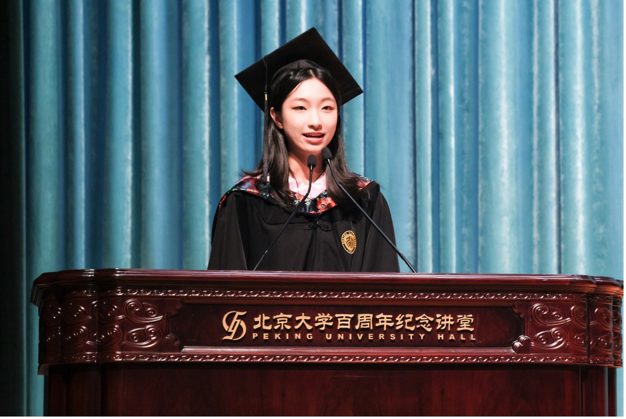 叶子青回顾了初入燕园时喊出的“爱推动我,让我说话”这句意大利语诗句,如今已成为四年外院生活最动人的注脚。从最初“因分数而来”到因热爱沉浸于意大利文学,她用一份“无用之用”的文学之爱,讲述了青年人对人文精神的坚守。同时,她分享了在中外交流、外事实践中的经历,以及投身国家外交事业的初心。她说:“毕业不是终点,而是新的起点。愿我们都能继续以爱为帆,沟通作桨,在人生的海洋上乘风破浪。”