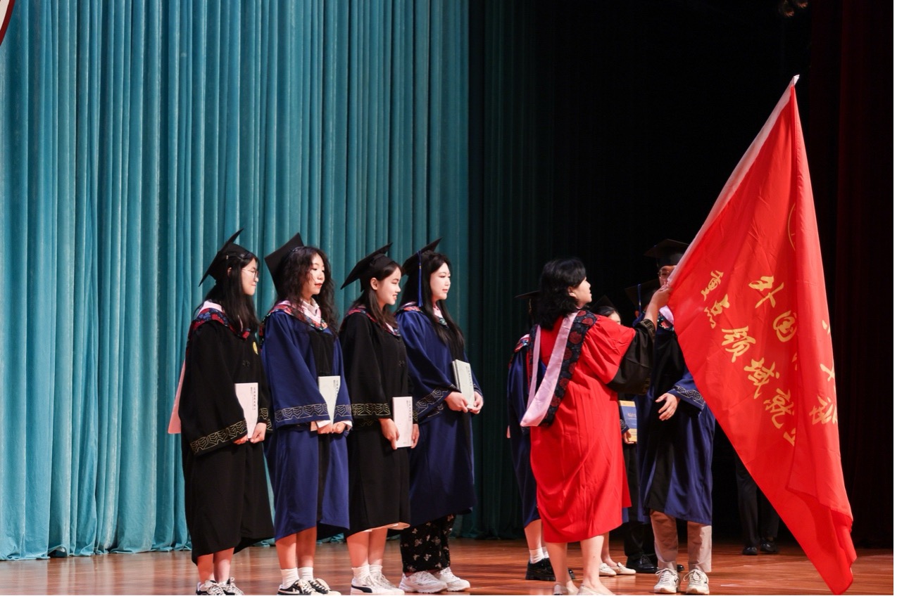 在重点领域就业毕业生出征仪式中,将赴祖国基层、绿色军营、国际组织等重点领域就业的毕业生代表上台,院党委书记李淑静为同学们赠书并授旗。2025届选调生代表、2022级德语系硕士生吕润洋接旗。天地广阔,大有可为,师长寄语同学们到党和人民最需要的地方去,“有一分热,发一分光”,不忘初心,砥砺前行,为实现中华民族伟大复兴凝聚磅礴青春力量。