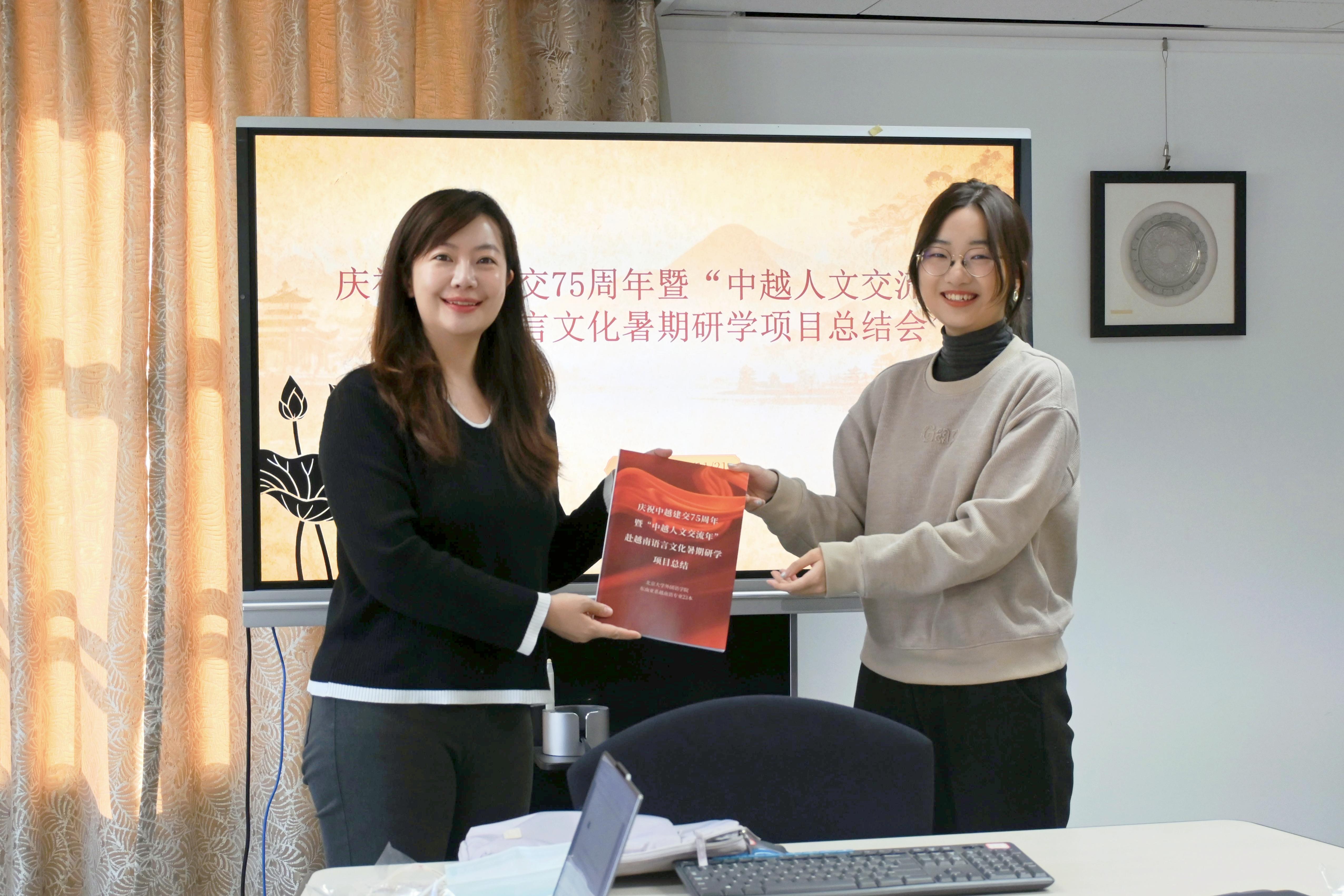 研学项目成果的展示随即展开,余一可同学代表23级越南语班向李卉老师代表的学院赠送了同学们撰写设计的项目总结报告书,内容涵盖本次项目活动总结、调研报告和心得感悟等多方面内容,全面展现了此次研学项目的内容和成果。