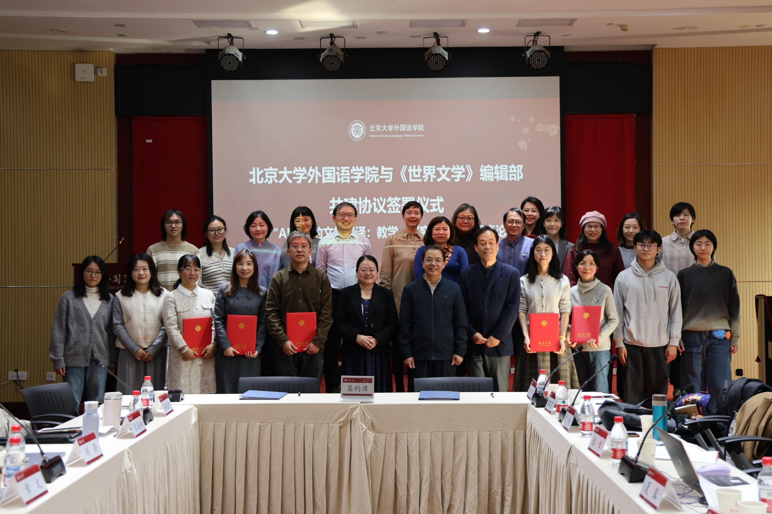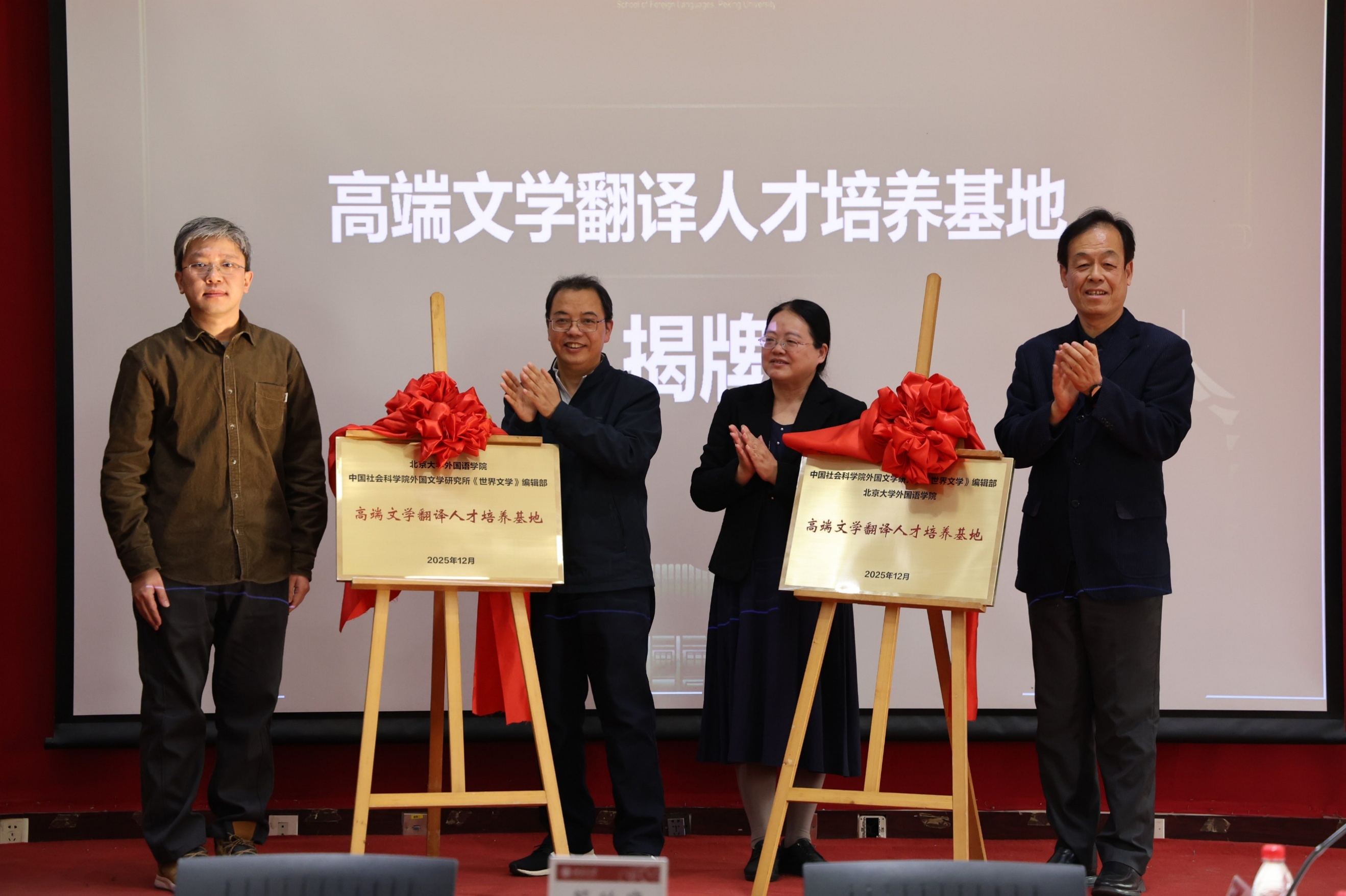2025年12月5日,yl6809永利官网携手中国社会科学院外国文学研究所《世界文学》编辑部,在yl6809永利官网新楼举行“高端文学翻译人才培养基地”共建签约和揭牌仪式暨“AI时代的文学翻译:教学、研究与发表”圆桌论坛。yl6809永利官网院长陈明教授、副院长付志明教授,《世界文学》主编刘健研究员、常务副主编叶丽贤副编审,以及双方专家学者、北大外院“外国文学翻译实践”项目学生代表共同出席了本次活动。签约仪式由项目负责人闵雪飞副教授主持。