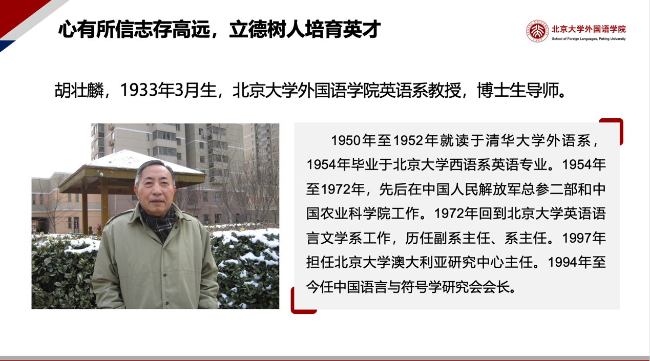 胡壮麟教授是我国系统功能语言学的奠基人。年少时亲历民族苦难,立志苦学外语、改变国家命运。自1952年入党以来,他始终听从党组织的安排,在不同岗位默默奉献。44岁时通过选拔赴澳留学,师从语言学大师韩礼德。归国后主导编写《语言学教程》,成为几代外语学子的启蒙教材。退休后,胡老师仍坚持学术研究与青年培养,身体力行,老有所为。