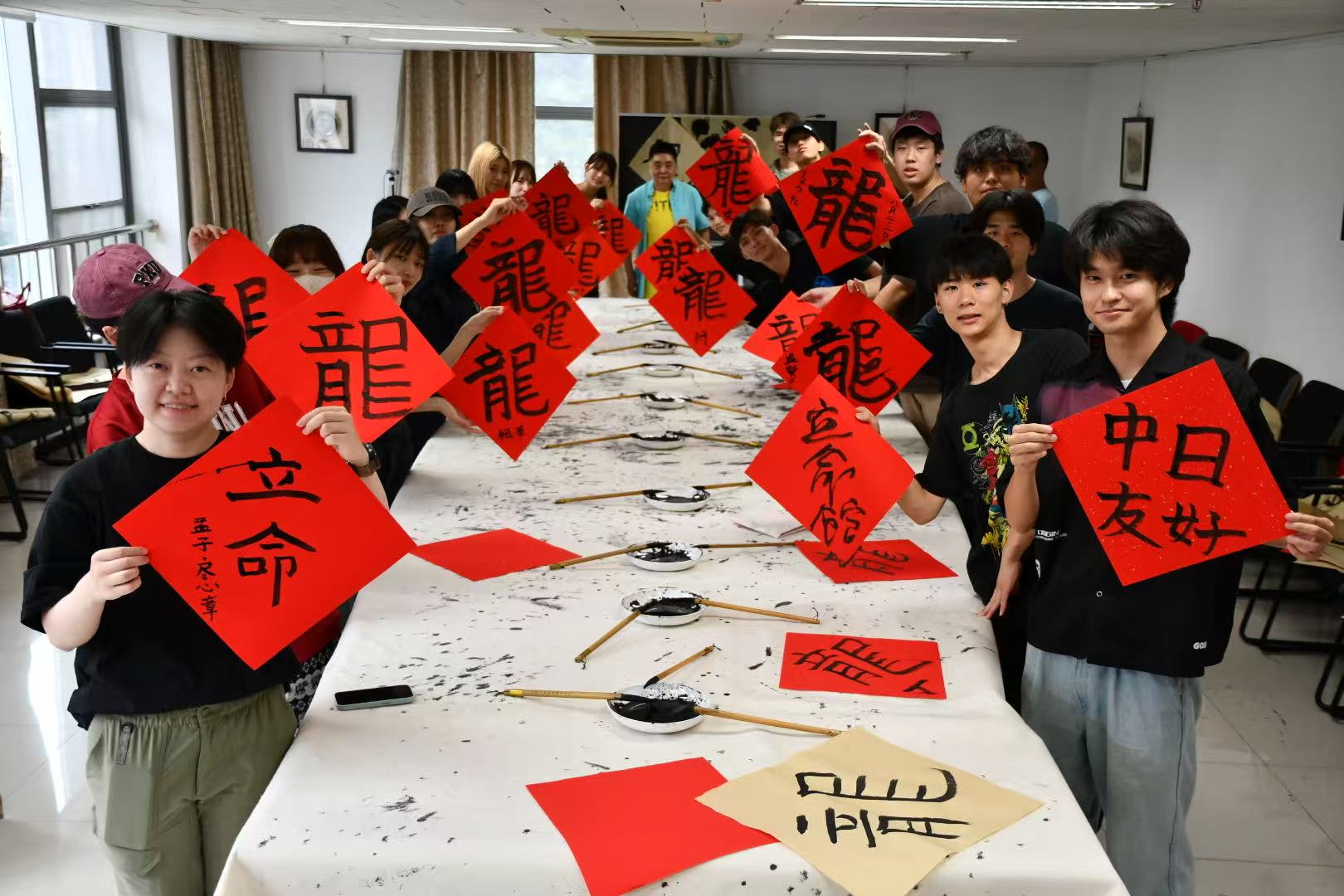 中华文化体验环节同样丰富多彩。学生们先后参加了茶艺、古琴和书法工作坊,亲身感受中华传统艺术的魅力。茶艺活动中,大家品鉴了多种中国茶类,了解茶文化历史与现代茶饮的创新发展;古琴课上,同学们在老师指导下尝试合奏《北京欢迎你》,体验中国古典音乐之美;书法工作坊则从春节习俗切入,通过书写“福”字和对比中日“龙”字,生动展现书法艺术与两国文化交融的历史。